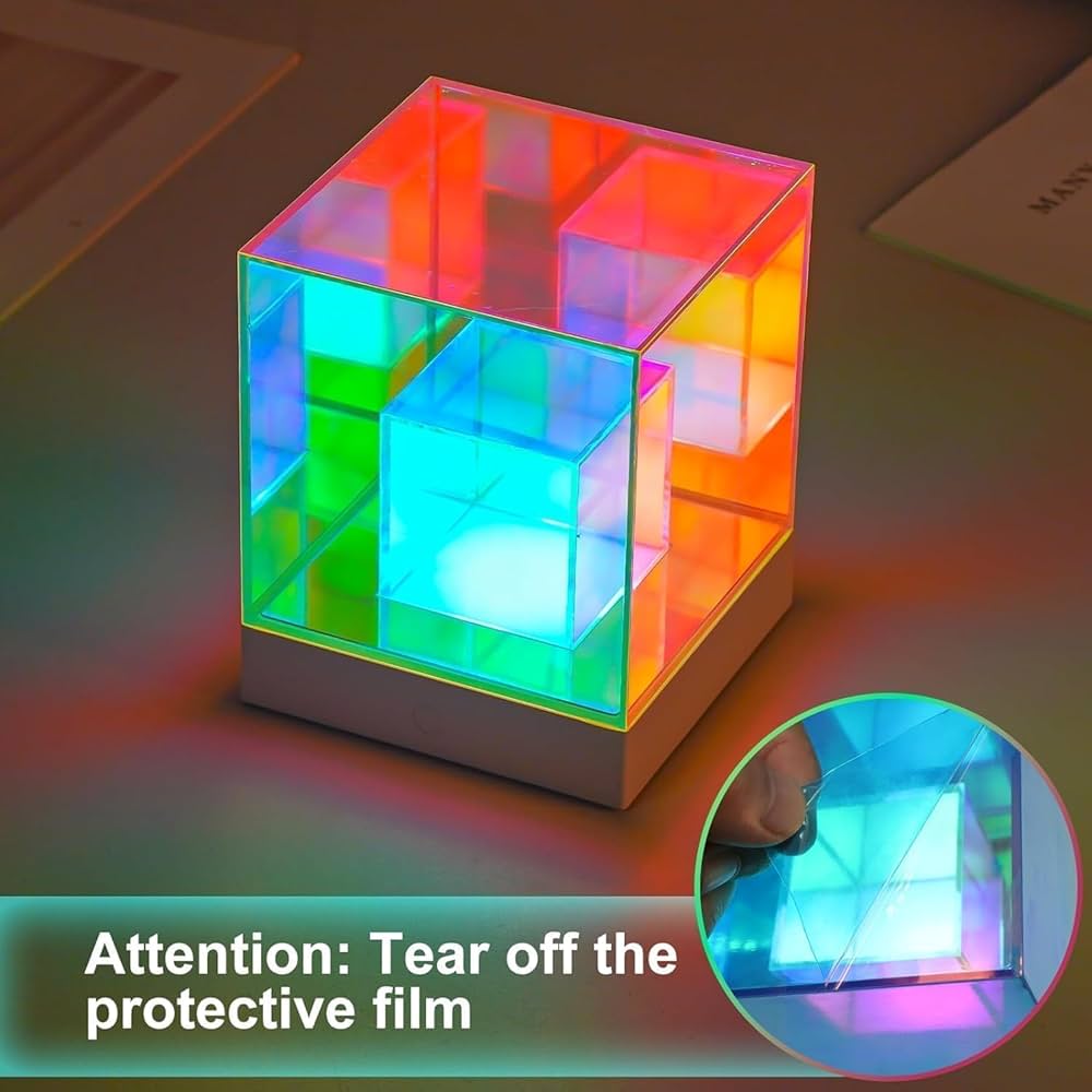 - Infinity Lamp: Each side of the cube is covered with a protective film to ensure it arrives in perfect condition. Be sure to remove this film before use. Setting up your 3D infinity lamp is a breeze. Just plug it into any power source, whether it's a USB power bank, computer, or USB extension, and enjoy the calming illumination.
