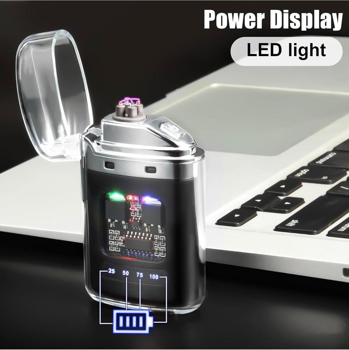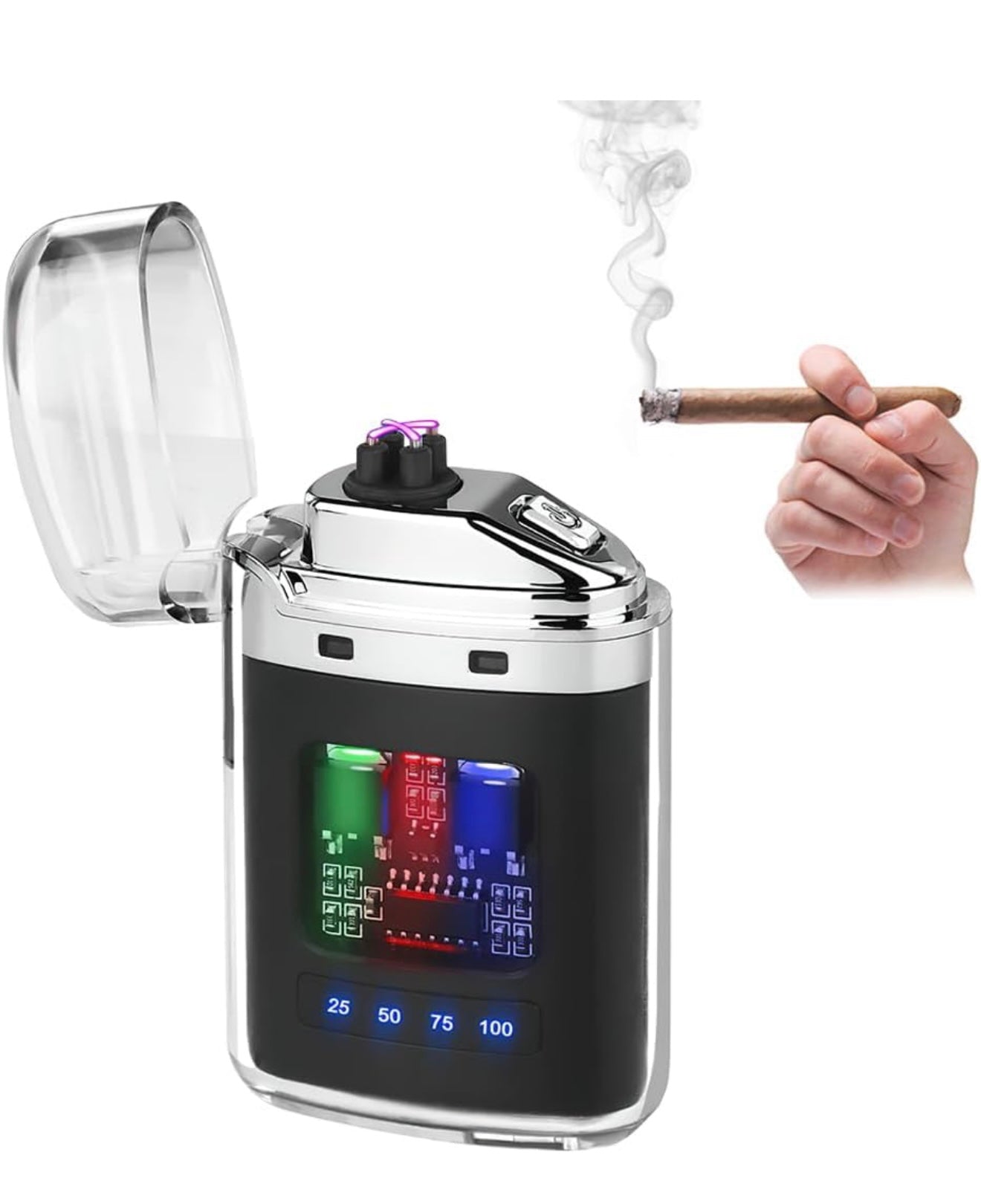 - Windproof & Flameless Plasma Arc – Safe, flameless double arc lighter works even in strong winds – perfect for camping or survival situations.
